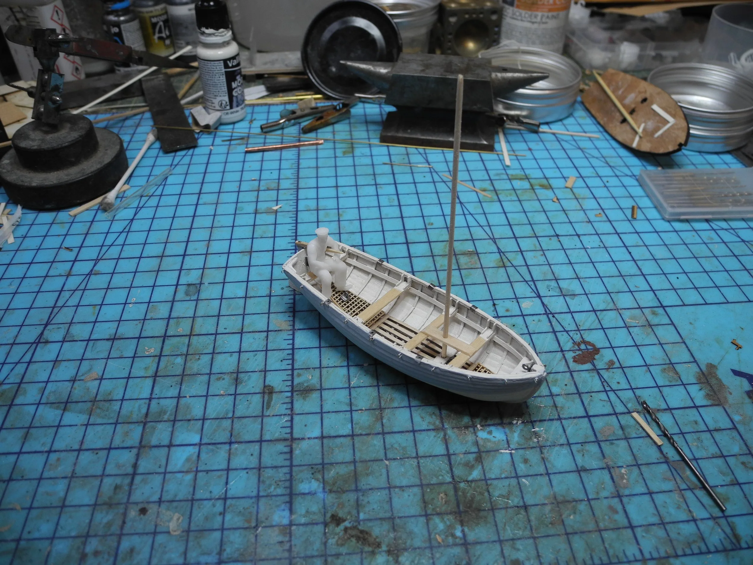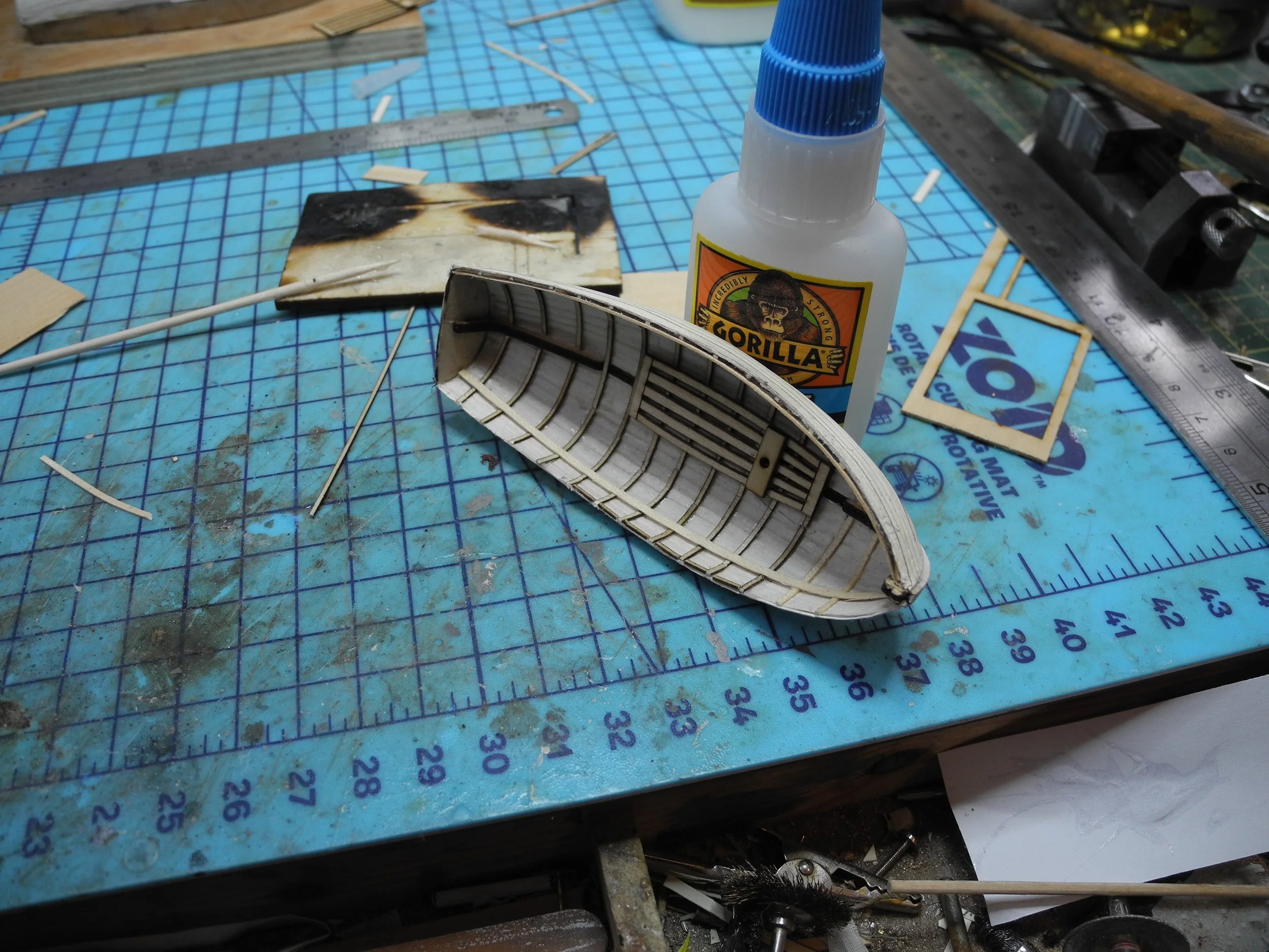 With the ribs, gunwale and shelf added, the shell is very strong. This is a 16ft dinghy at 1:48th scale nearing completion.