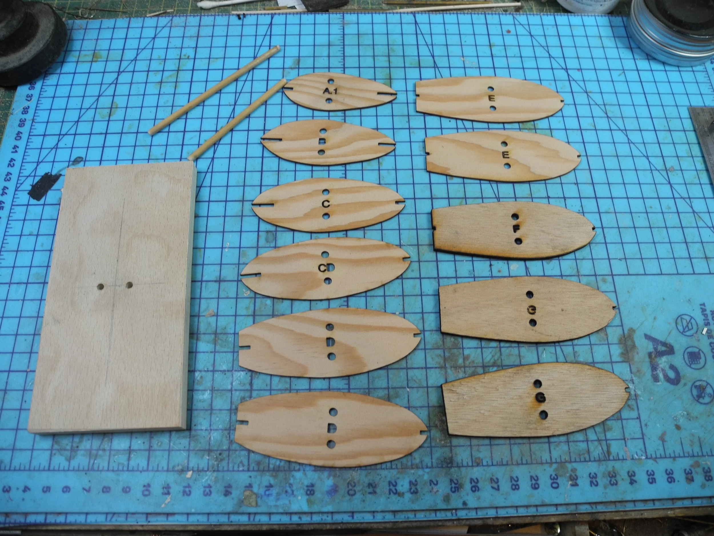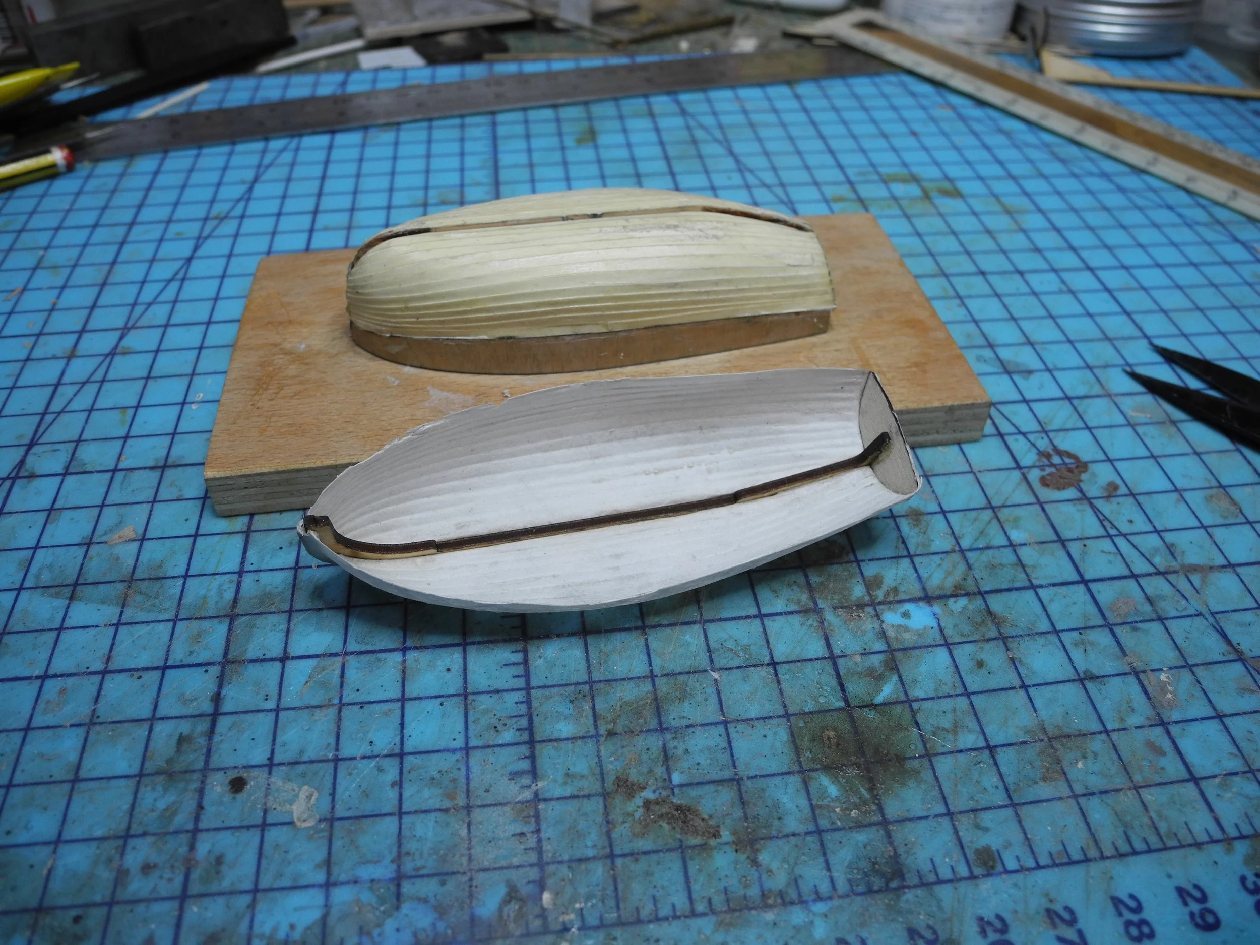 Once dry, this can be cleaned up, the final shape of the keel sanded back and progress can be made on fitting out the inside of the shell. The image below shows the gunwale packers being fixed in place. The ribs can be made from card or veneer (which has been used in the image below)